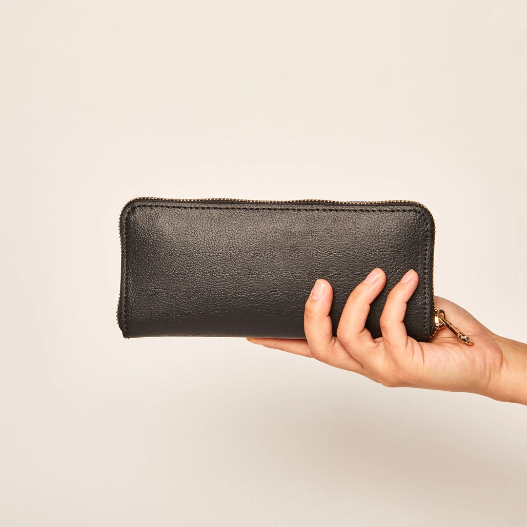 Classic wallet with colorful interior crafted from upcycled apples, among many recycled and plant-based materials. This large wallet has separate zipped and slip pockets as well as eight card slots and four note slots.