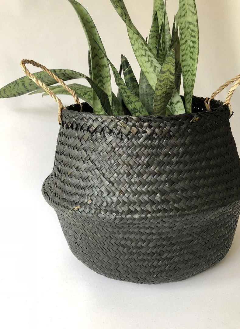 The Kophinos Basket in Black is a durable, handwoven basket available in two sizes.