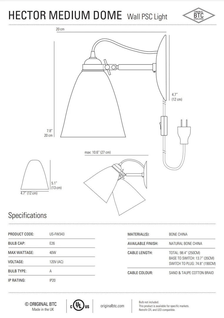 Original BTC is a family-owned and family-run lighting company based in London, England using only the finest natural and raw materials sourced in the United Kingdom for their high-quality, handmade lighting. Each piece of Original BTC’s exemplary table, floor, pendant and wall sconce lighting are crafted with care by ceramicists, metalworkers, and nautical craftspeople dedicated to making only the world’s finest lighting. Original BTC’s lighting is recyclable and is made to last generations using bone china light fittings, solid aluminum, copper, brass, and iron. Each piece of lighting is accentuated by cotton braided cables, exceptional satin chrome bases and a beautiful array of colored shades. All Original BTC’s products are UL certified, all components made in England, and all workers are paid a living wage.