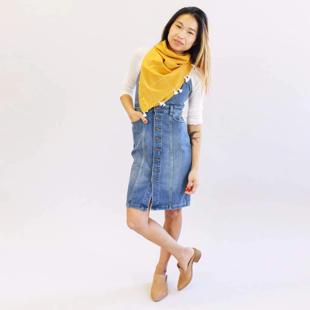 Complete your warm weather look with Anchal’s golden yellow square tassel scarf. Featuring a hand-stitched grid pattern, this incredibly soft and lightweight scarf an must-have addition to your accessory collection. The edge is finished with tassel detailing adding a playful element to this perfect organic cotton scarf.