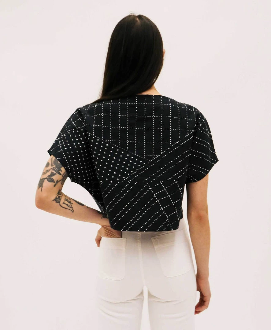 This modern flexible shape flatters all body types by accentuating the shoulder line & lifting the eye with a crop fit. Wear as a sophisticated evening look or a casual top for the office, these patterns are sure to delight.