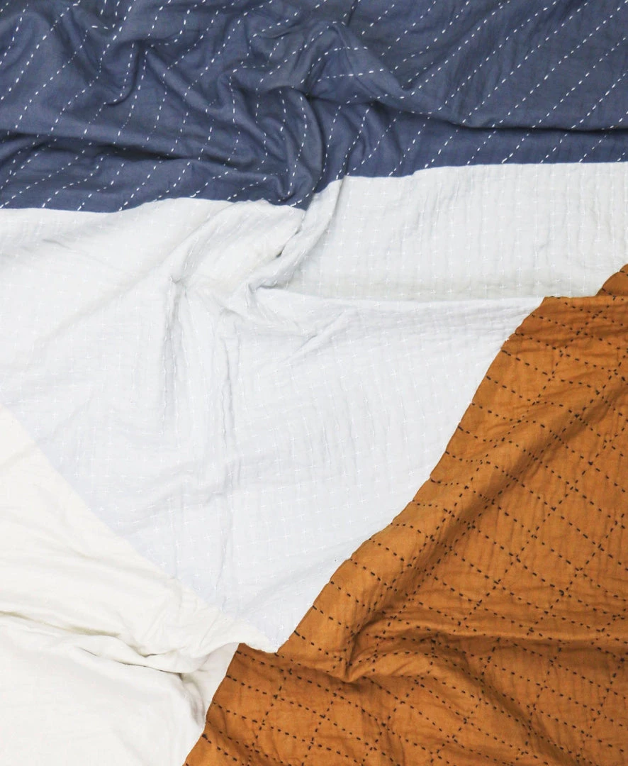 Naari quilted throw blends traditional kantha quilting techniques with contemporary geometric designs. Handcrafted with organic cotton, this reversible quilt features detailed stitch patterns and paneling, creating bold, dynamic intersections of color and texture. Charcoal-black edging adds the finishing touch to this heirloom textile art.