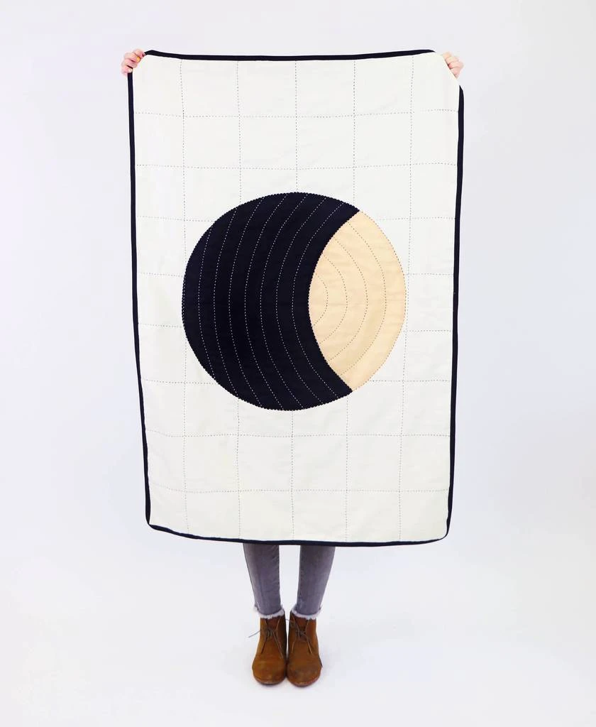 Featuring a hand-stitched circular geometric composition with a timeless color palette, this small organic cotton quilt is sure to make a statement in any room. Place in the nursery as a contemporary baby blanket, on the sofa as a lap blanket or hang as a wall tapestry and let this beautiful piece of handmade textile art speak for itself.
