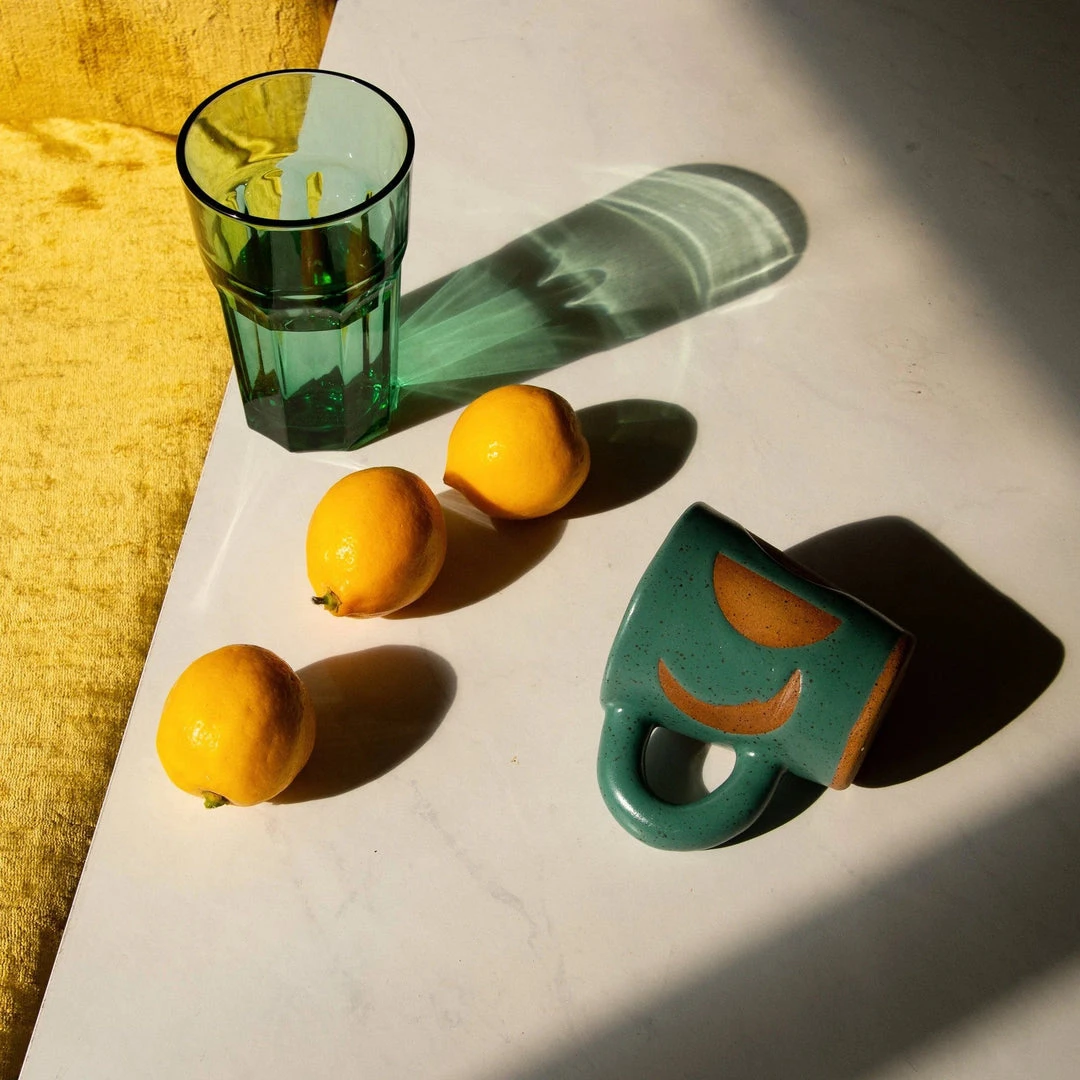 Features a 360 degree lunar phase pattern. Available in buff clay with a matte white or spruce green glaze.Â