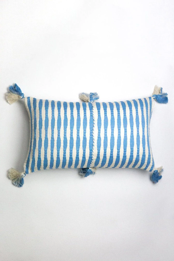 This sky blue pillow is inspired by traditional textiles from Almolonga, Guatemala. The cotton used to make this pillow was handwoven by artisans using a back-strap loom.