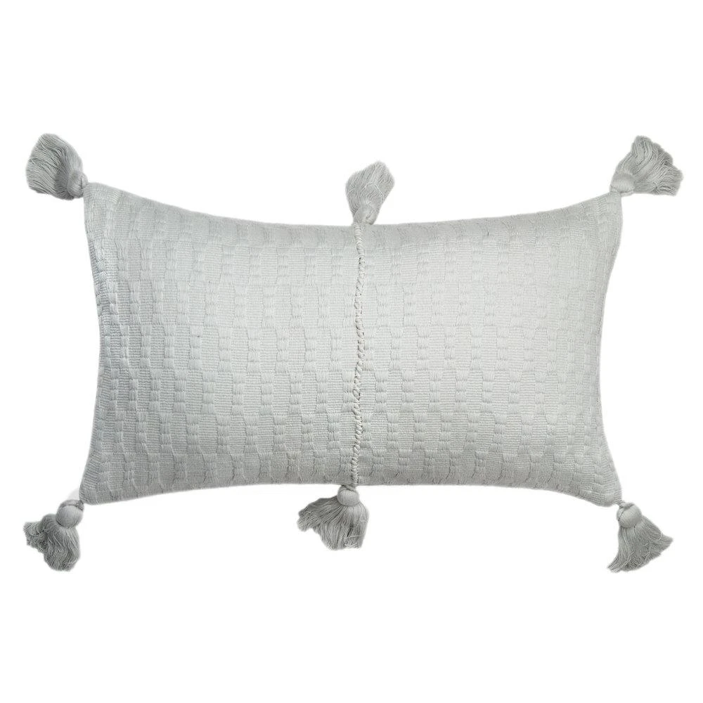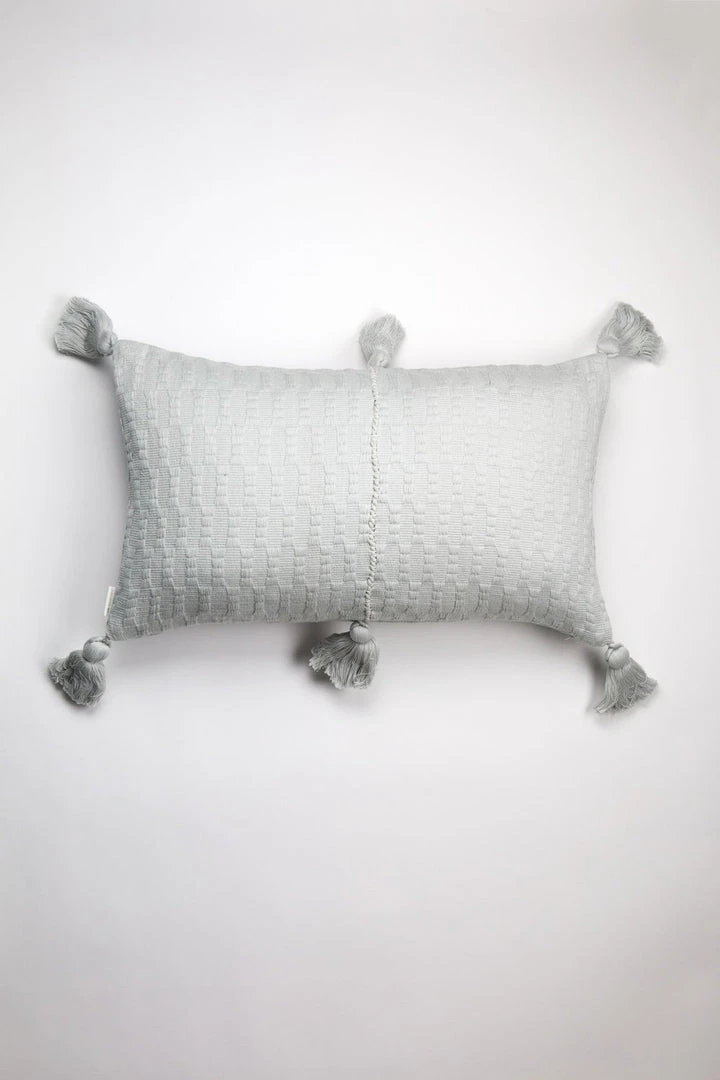 This gray pillow is inspired by traditional textiles from Almolonga, Guatemala. The cotton used to make this pillow was handwoven by artisans using a back-strap loom.