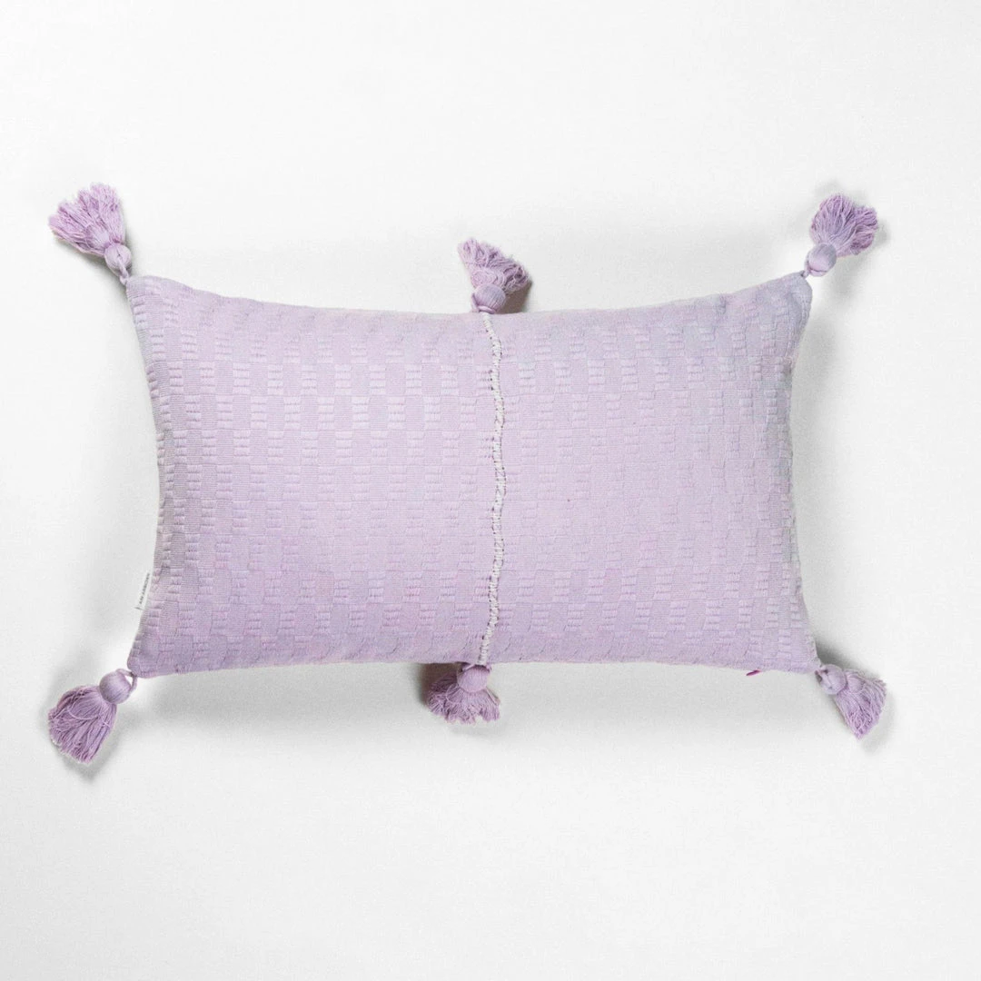 This light lavender pillow is inspired by traditional textiles from Almolonga, Guatemala. The cotton used to make this pillow was handwoven by artisans using a back-strap loom.