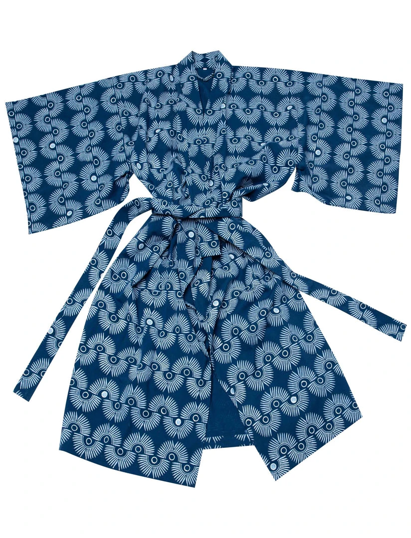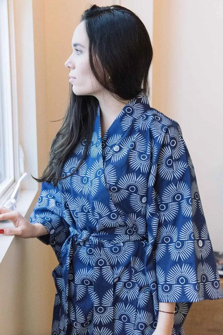 These robes are made with ultra-soft cotton and are perfect for lounging around the house or a weekend getaway. It features two pockets and a wrap belt. It was made using a traditional block-printing process. Wooden blocks are carefully prepared by master carvers which are then dipped in dye and stamped onto the fabric.