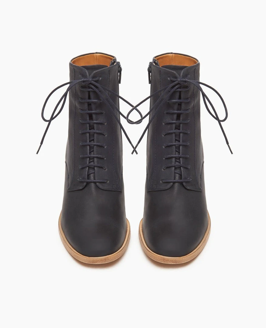 Elegantly casual, the Bina Boot offers a fresh take on the time honored lace-up boot. Featuring a 10 eyelet lace-up and an inside zip closure. A carefully layered wood heel sets this boot apart from the rest, slightly inset from the sole.
