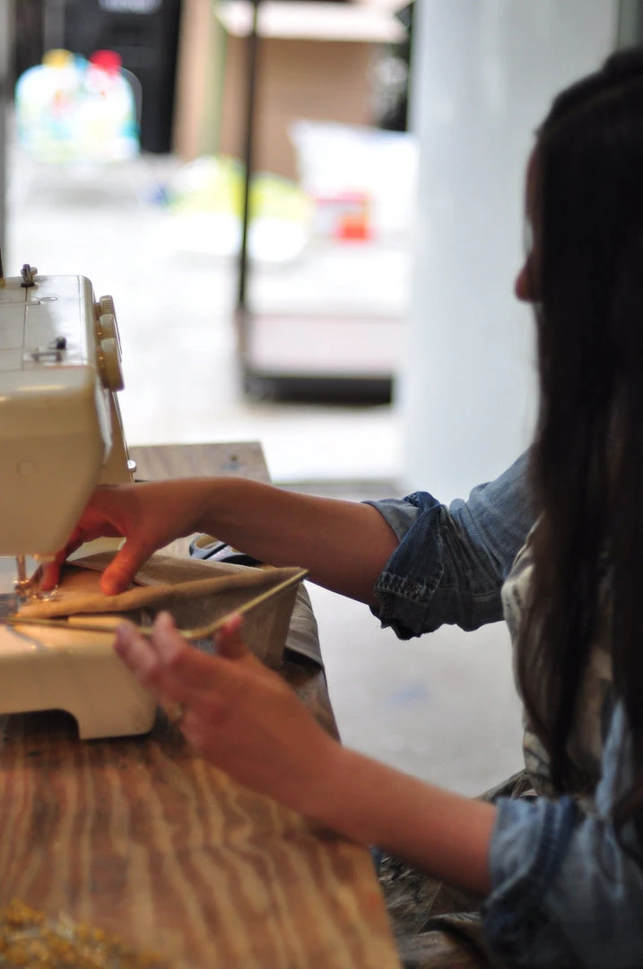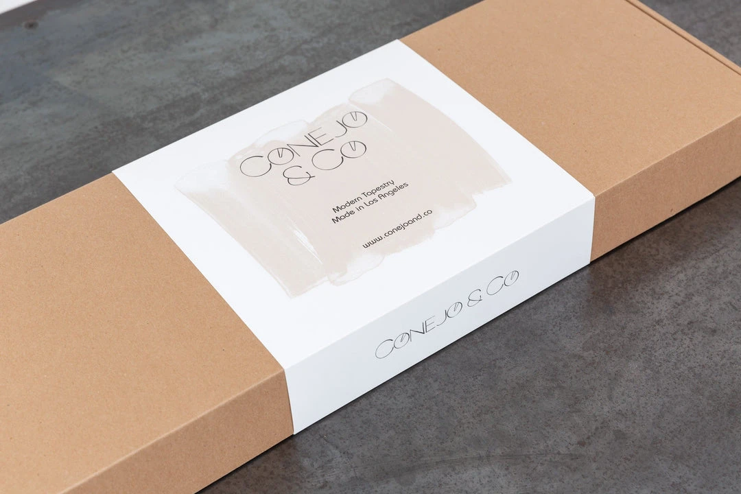 These contemporary, three-panel wall hangings are hand-painted in Los Angeles using metallic gold, ochre, and earth artist’s acrylics and graphite on natural linen. The raw, solid brass hardware was machined in Los Angeles as well. Each piece is made just for you, making them one of a kind.