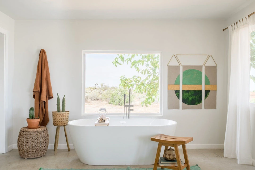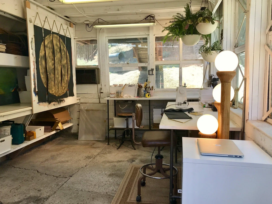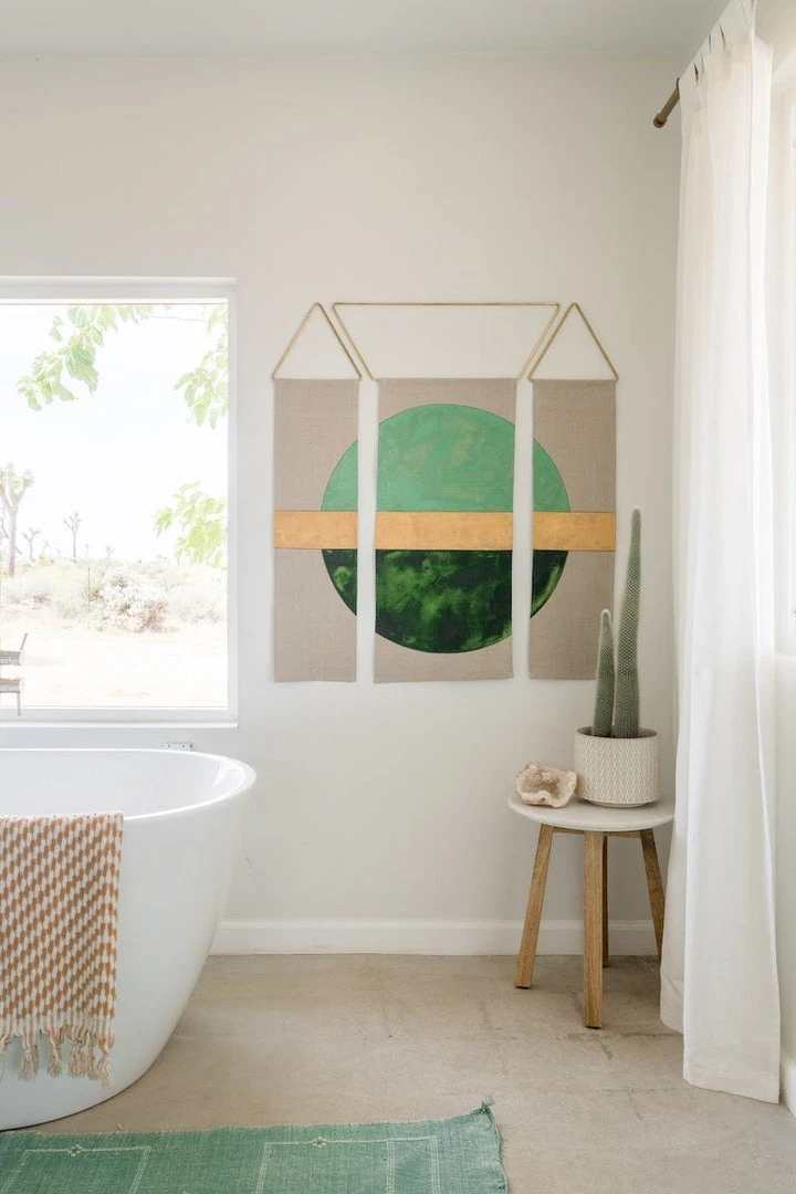 These contemporary, three-panel wall hangings are hand-painted in Los Angeles using metallic gold, light, and dark green artist’s acrylics and graphite on beige linen. The raw, solid brass hardware was machined in Los Angeles as well. Each piece is made just for you, making them one of a kind.