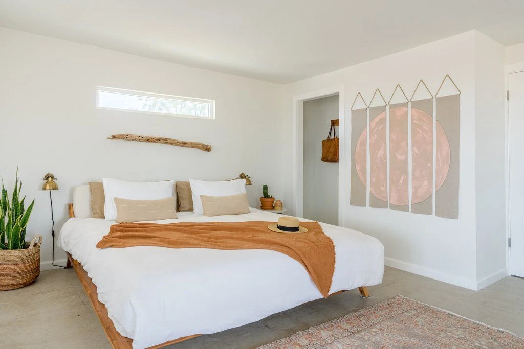These minimalist five-panel wall hangings are hand-painted in Los Angeles using titan mars artist’s acrylics and graphite on beige linen. The raw, solid brass hardware was machined in Los Angeles as well. Each piece is made just for you, making them one of a kind.