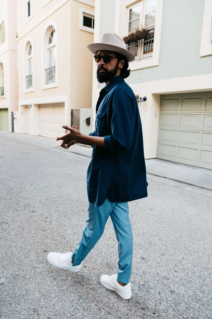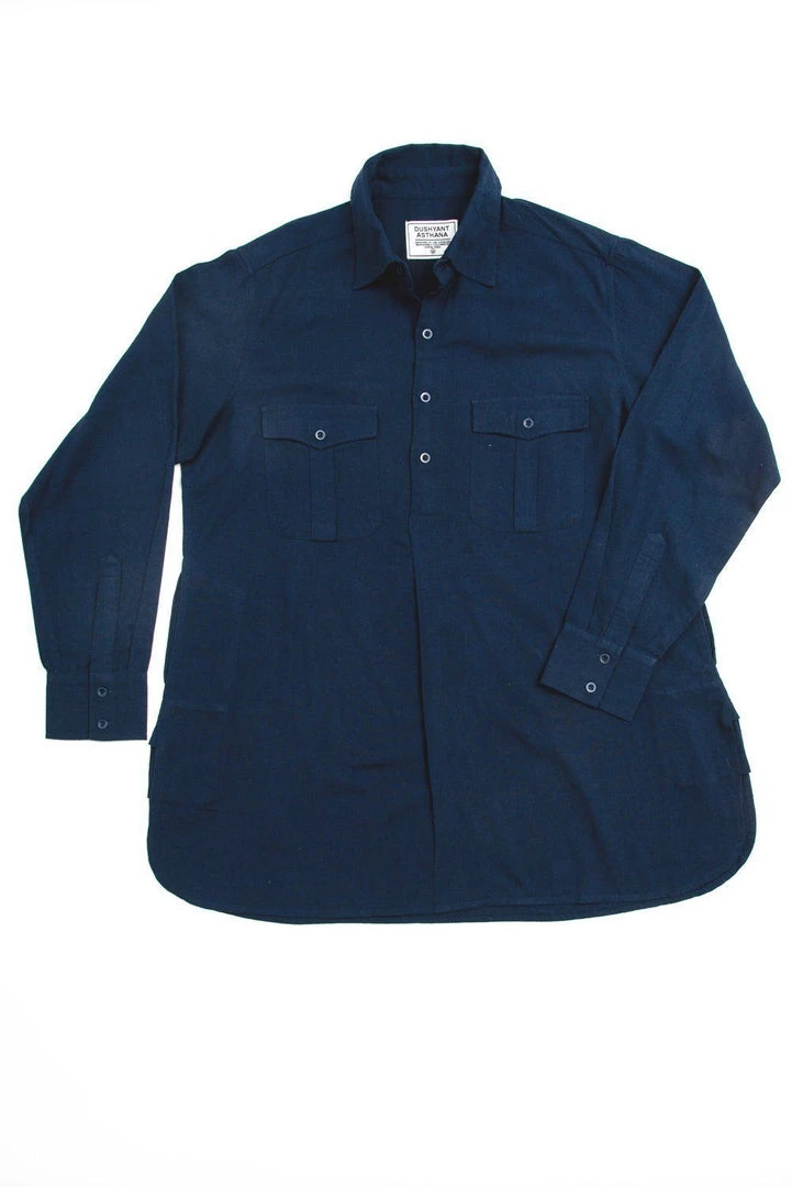 A men’s oversized button down shirt with military-style front pockets in indigo. This heritage style shirt was designed in Los Angeles and made in an ethical environment in India. The perfect addition to your sustainable wardrobe to be dressed up or down.