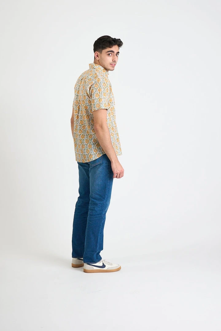 The Prat Short Sleeve Shirt is an everyday shirt with an elevated look. Featuring a Citrus colored floral design that is hand screen printed in small batches, which naturally have inconsistencies giving this shirt an elevated handcrafted look. Please note that the actual color of the shirt may differ from the pictures due to computer lighting and hand-made nature of the fabric.