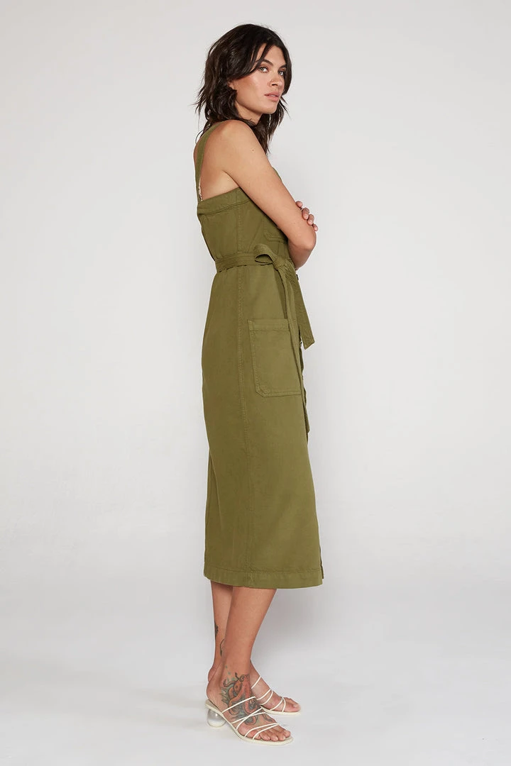 A feminine silhouette with a square neck and a self belt. Natural mineral dyes and a lofty organic twill fabric add a cool vintage texture