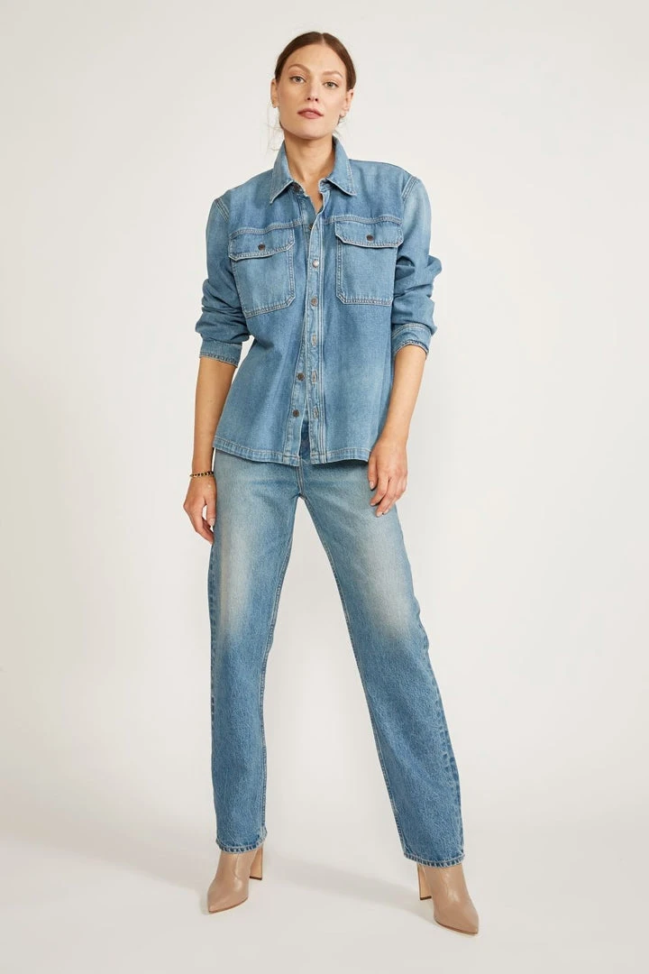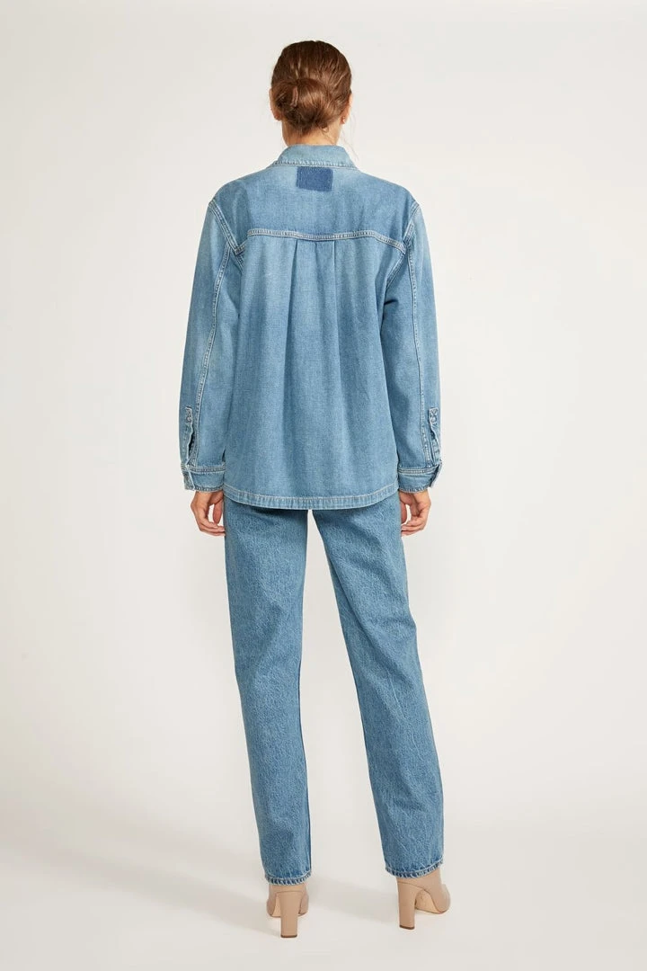 A workwear-inspired piece crafted from a hearty chambray fabric, finished with natural wear effects and front utility pockets. Harriette is designed with seasonless appeal, to be worn a classic denim shirt or open as a jacket.