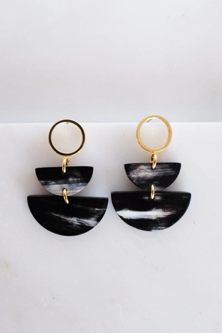 These earrings feature two cascading crescent moods made from ethically sourced water buffalo horn from Hanoi, Vietnam on a circular earring post. The water buffalo horn is a by-product of waste, processed chemical-free, an organic material, and a one-of-a-kind piece. This sustainably luxe post dangle earrings is the perfect accessory to elevate your work outfit, weekend ensemble, and your evening wear.