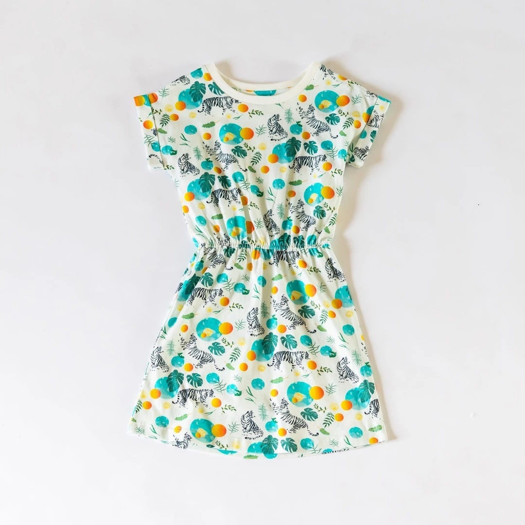 This jungle print short sleeve dress is the perfect dress for your little one that’s equally comfy as it is cute. Featuring an elastic waistband and rolled sleeves. For every dress that’s purchased, Honey Cake Tiger will plant a tree.