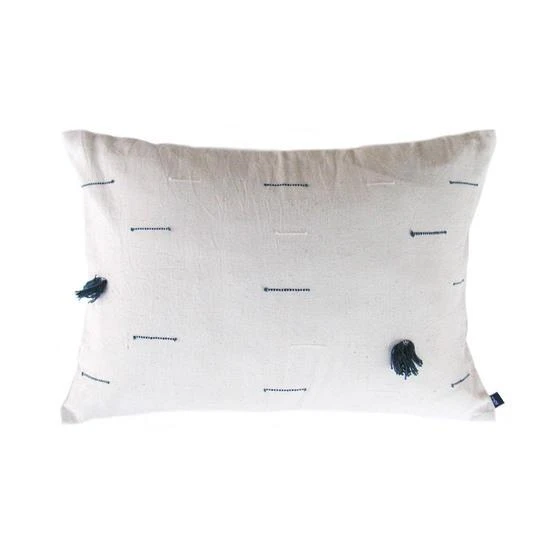 This large white and blue pillow is simple yet adds a great deal to the bedding. The blue cotton inserts are added while weaving. The fabric is made from organic cotton that is hand spun and woven by artisan weavers on the handloom.