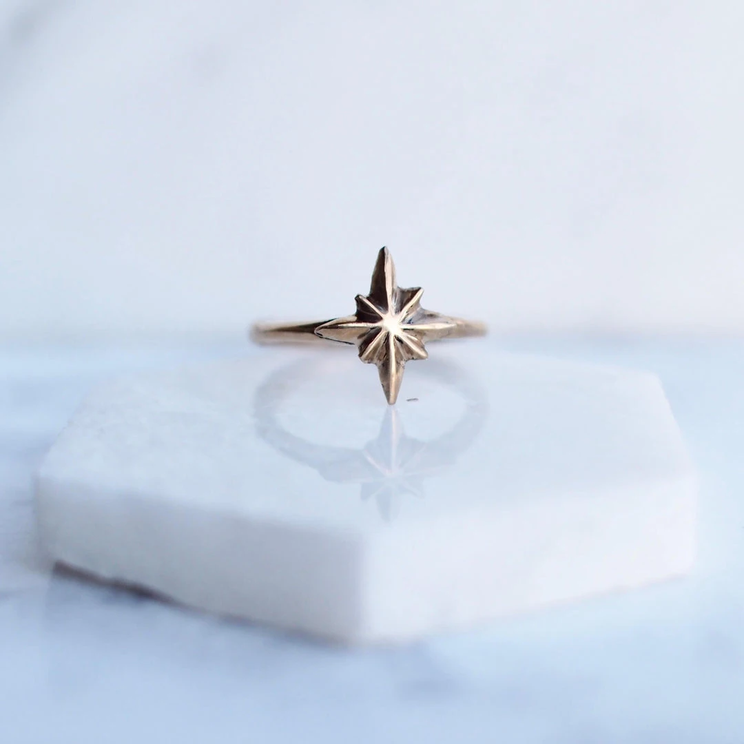 This little star ring features a delicate North Star shape, creating a celestial motif at your fingertips. The Aster ring is simple, dainty and sweet and nests perfectly with the Aster Halo Stacking Band. Each ring is cast by hand in solid gold tone bronze or sterling silver.