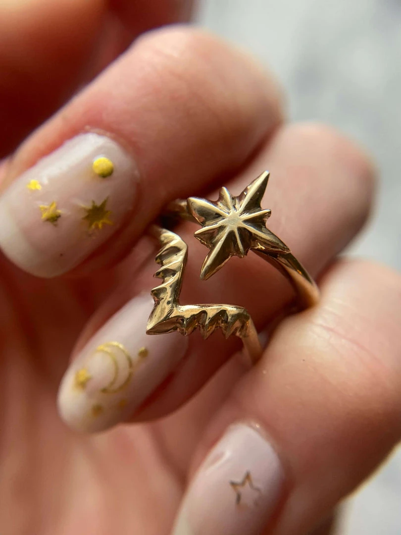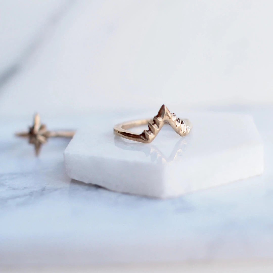 This perfectly nesting stacking ring set features a delicate North Star shape that stacks with a V-shaped band that almost looks like a little crown. Together they create a lovely celestial motif at your fingertips.