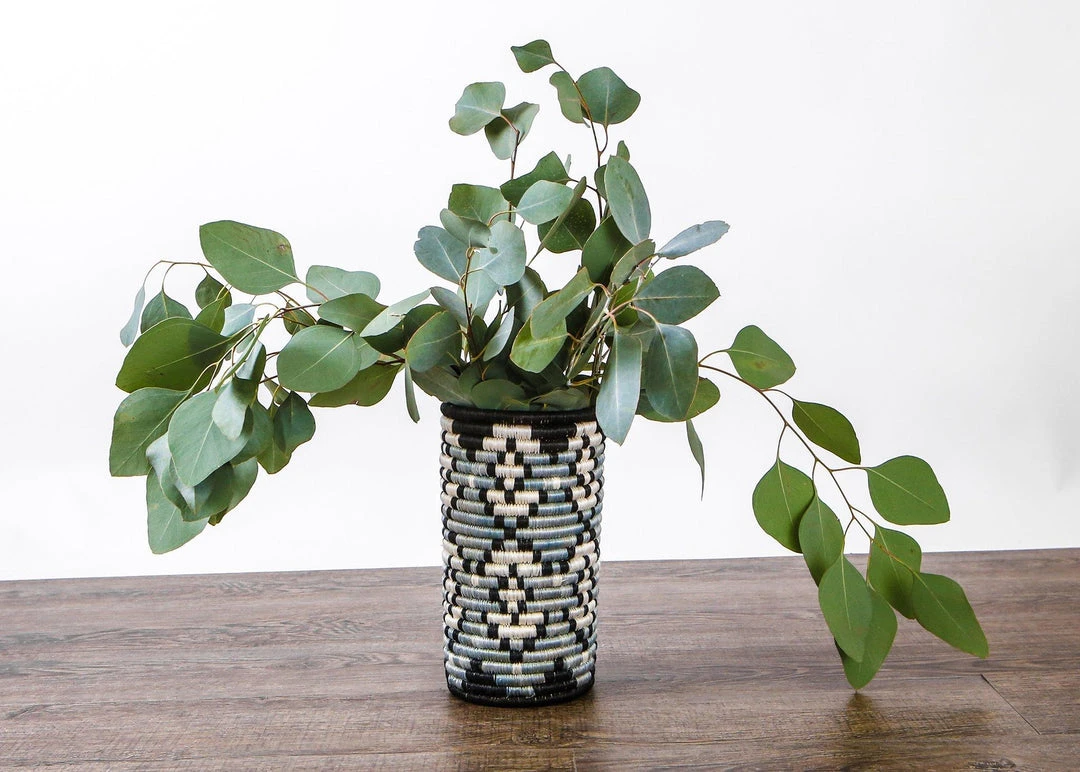 This handwoven cylindrical vase is a stunning statement centerpiece. Includes a glass liner so it can hold a beautiful floral arrangement. Crafted by a cooperative of women who use traditional weaving techniques.