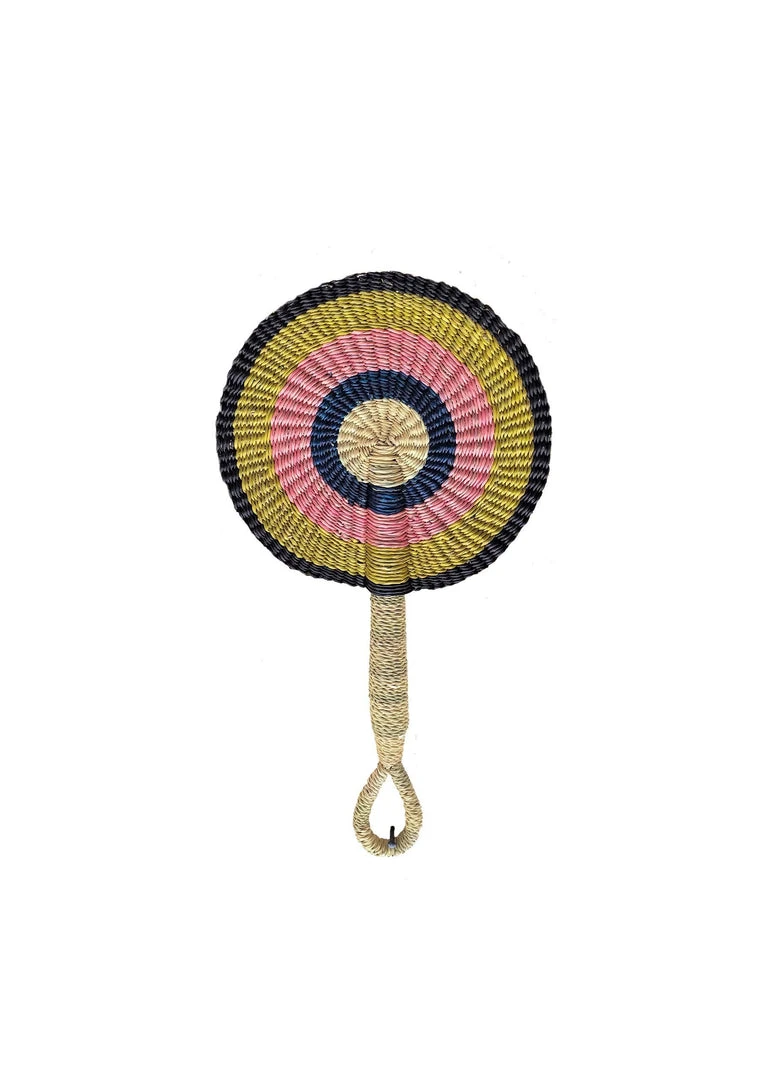 Style this Indie Round Hand Fan on a wall either alone for a minimalist look, or with other wall art for a dynamic look. Try it on a bookshelf to create a textured display. Includes a leather handle.