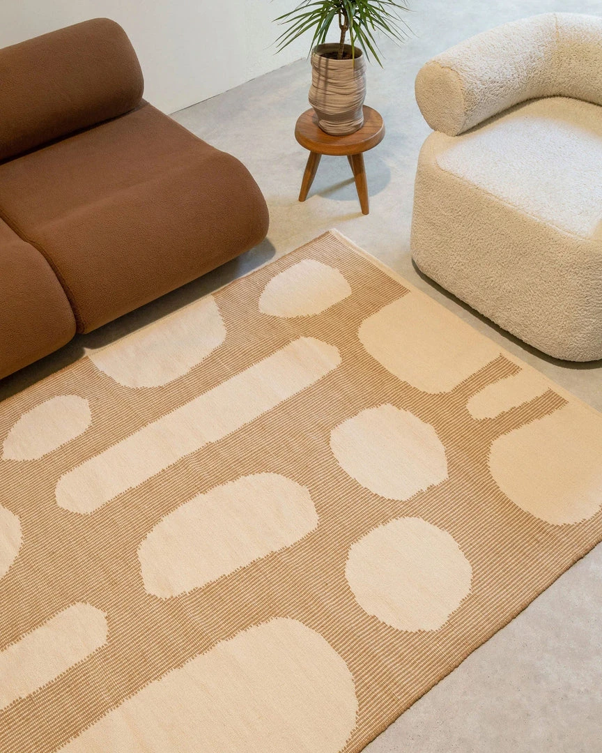 All of the colored wool yarn in their rugs and pillows is spun from upcycled remnants from Cairo carpet factories to make use of fibers that may otherwise be discarded. Slight variations and imperfections are embraced.