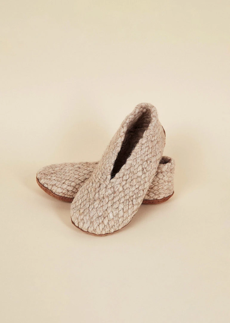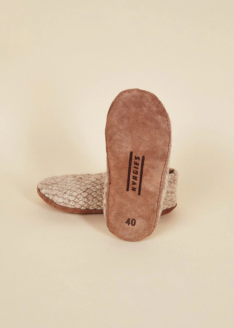 These woven house shoes are Kyrgies’ softest pair yet, made with a thick woolen yarn and a vegetable tanned leather sole. The knit makes them flexible to accommodate delicate and wide feet, while making them easy to pack up and bring along on a trip. The woolen material is naturally moisture wicking and odor resistant to keep you comfortable all year long.