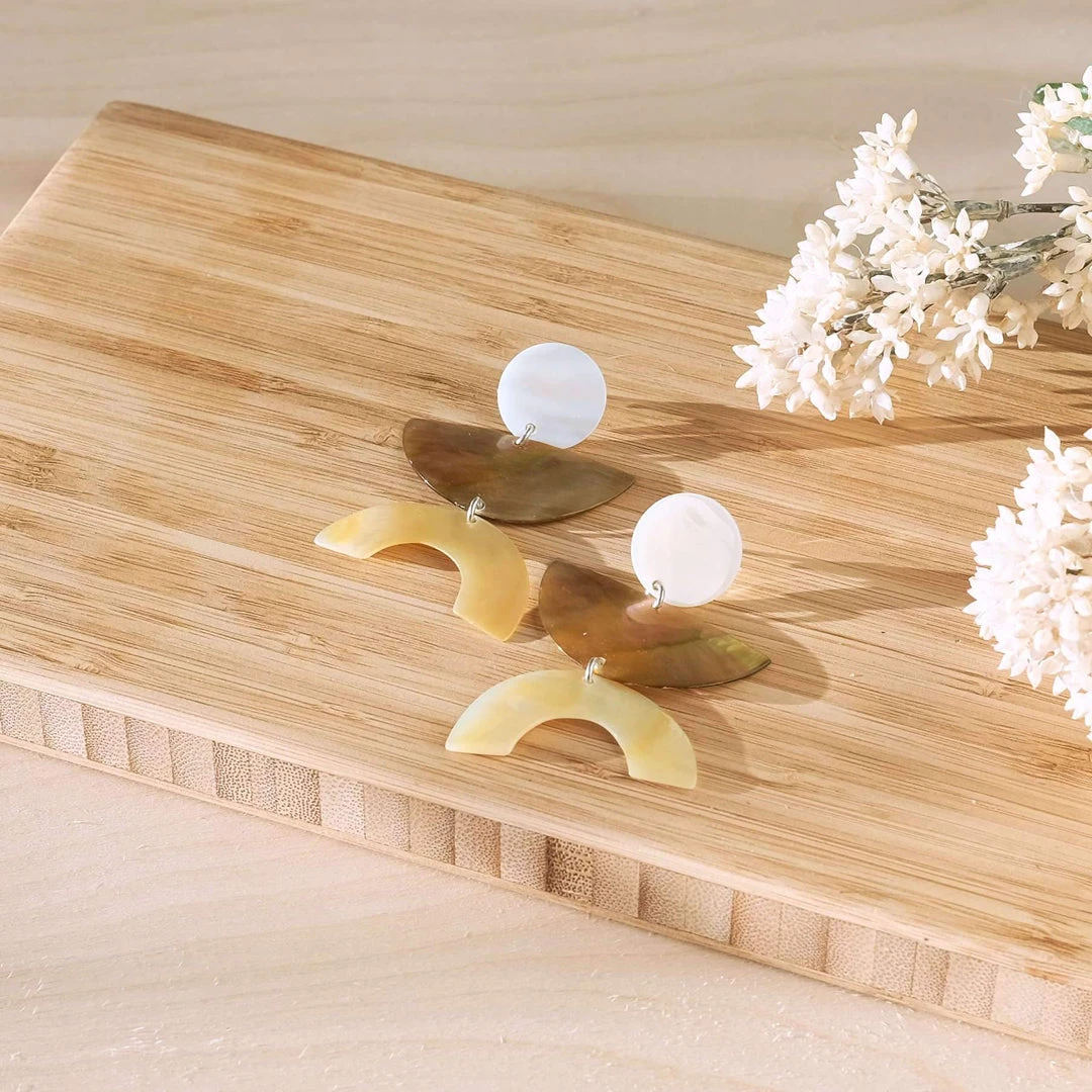 Hand carved, cut, and polished by master artisans, these statement geometric earrings add the perfect accent to any outfit. The mother of pearl is sourced as a byproduct of the food industry. Due to the material and production process, slight variations in color, pattern, or texture may occur naturally.