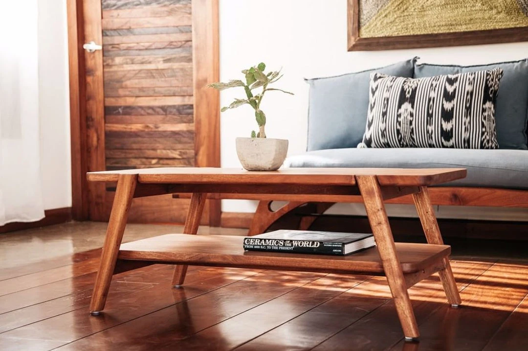 Masaya & Co. Apanas Coffee Table is a mid-century-modern style coffee table handmade from sustainably sourced tropical hardwood. It is perfect for living rooms, TV rooms, rec rooms, or any area where a stylish table with storage is needed. Features a shelf underneath the tabletop, great for storing books and games.