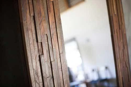 This geo hall mirror makes a tasteful hall, living room, or bedroom mirror. The frame is made from a mix of Rosita Walnut, Royal Mahogany and Teak, blended together in a rustic fashion to provide a solid and attractive frame for this large rectangular mirror.