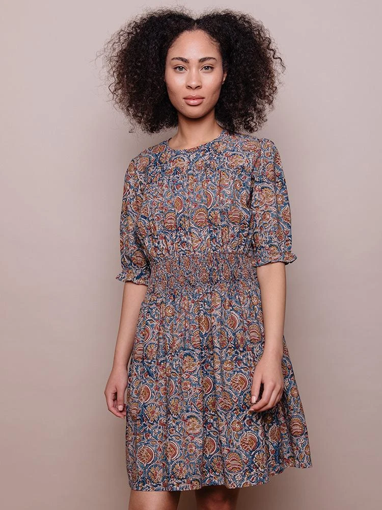 Henrietta is ready to be a date night dress with romantic ruffles, pleats, and a ruched waist. Featuring traditional block print fabric and natural dyes, this style is ready to be a conversation starter.