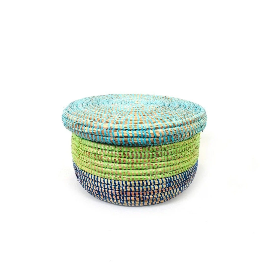 These perfect storage containers have both practical functionality and a contemporary look that would look at home in practically any space. With their cool Coastal Blues color way and rounded shape they are perfect for hiding all the little messes of everyday life and make your space tidy and beautiful. Wolof women in rural Senegal weave these baskets from millet grass, and plastic threads which add strength and durability.