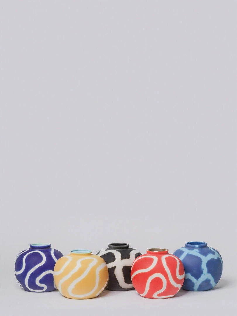 From left indigo, yellow, black, coral red, and mountain lake.