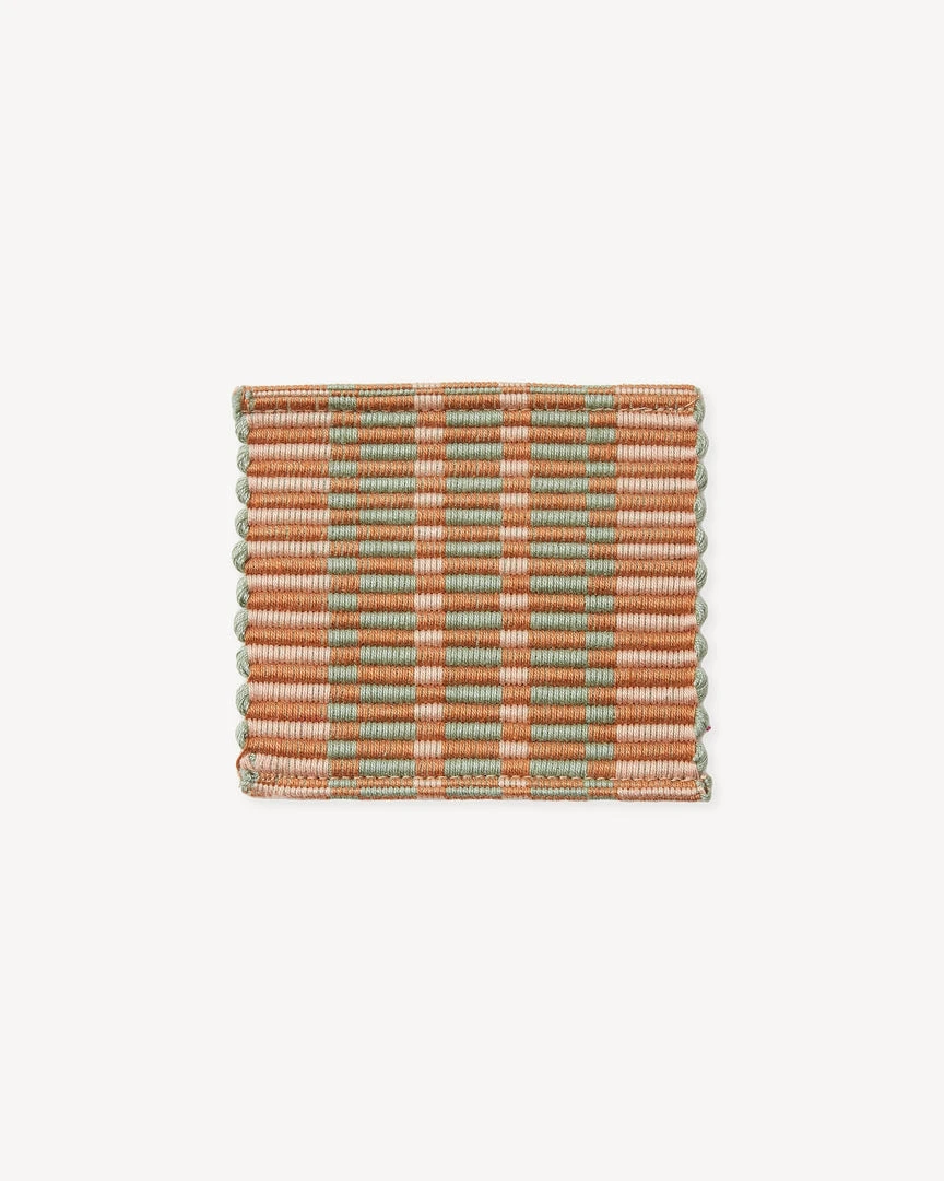 The Ridges Coasters are woven on the pedal loom to the finished measurements, so that no waste material is created. Due to the nature of handcrafted goods, slight variations are embraced.