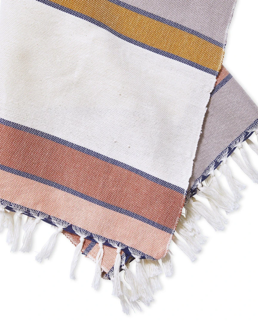 The Sunrise Stripe towels are a warm addition to any kitchen or bathroom. Woven by a man named Manuel in the village of Nahuala. Soft enough to function as hand towels, and durable enough to soak up spills around the kitchen. Finished with a rustic edge and fridge. Due to the nature of handcrafted goods, each towel may differ slightly.