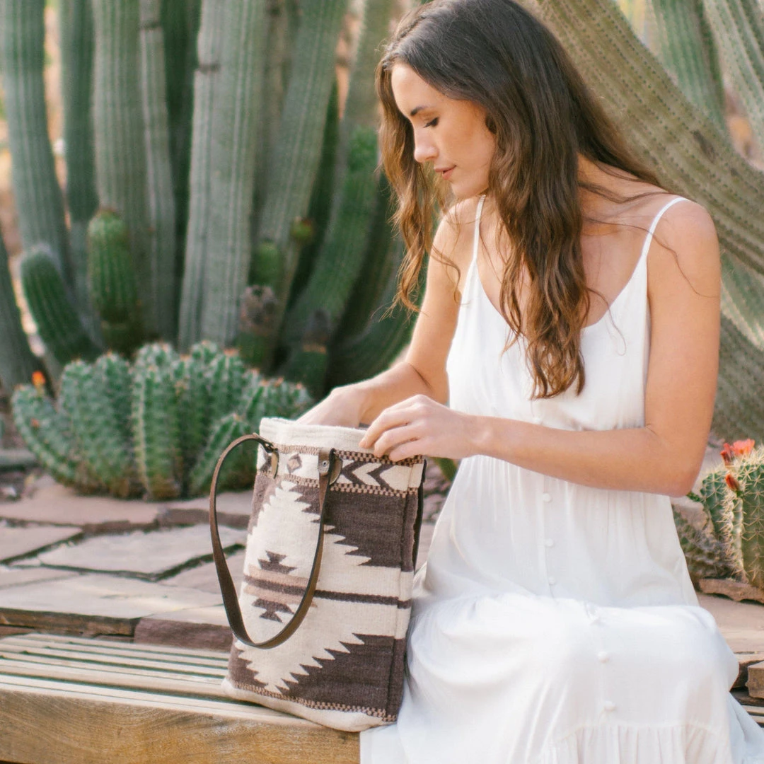 The Tierra pattern features a traditional Zapotec diamond and arrow design in shades of eggplant, rich chocolate brown, dusty mauve, and cream. This earthy color palette will easily transition from season to season, perfect for a tote lovingly handmade to last.