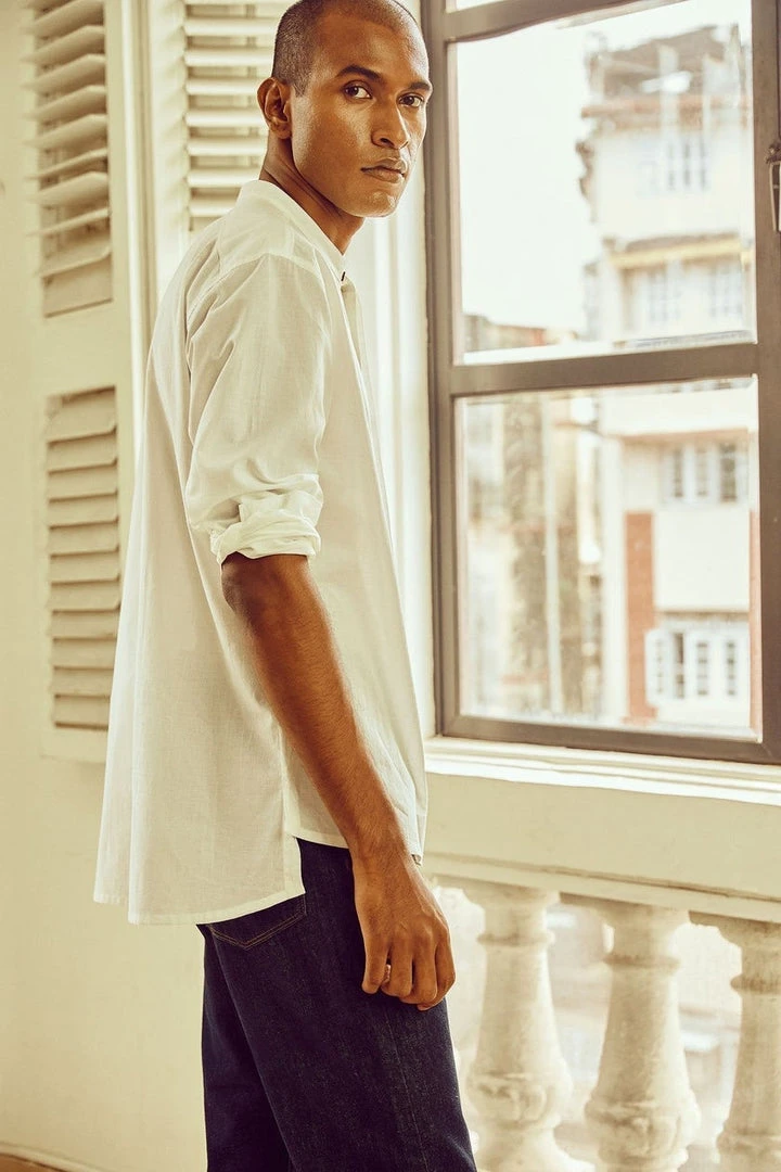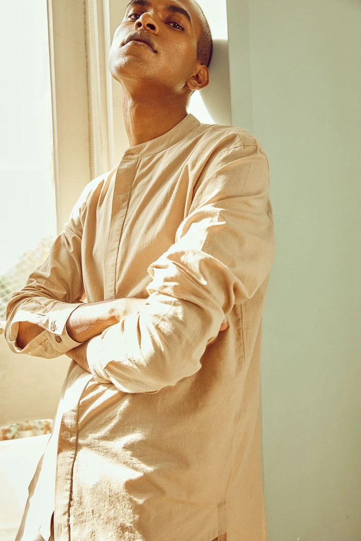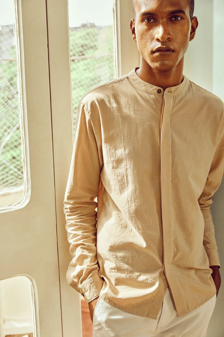 A nice and easy lightweight shirt with a relaxed fit, mandarin collar, side splits, and a hidden placket with coconut shell buttons.