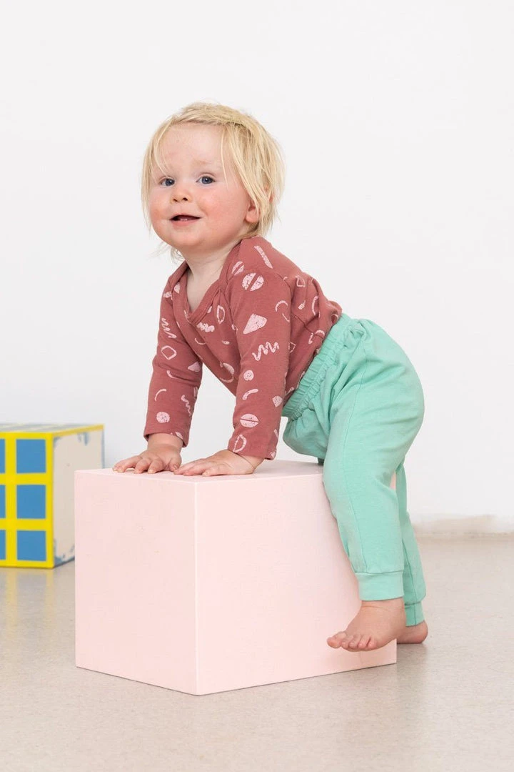 Organic, pre-shrunk harem pants in Seafoam. Stretchy, roomy, and comfortable for your little one.