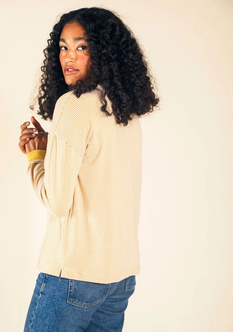 The Billie Striped Long Sleeve Tee comes with a slouched shoulder, ribbed crew neck and cuffs, and a relaxed fit, and is made of a premium blend of Bamboo and Organic Cotton Jersey.