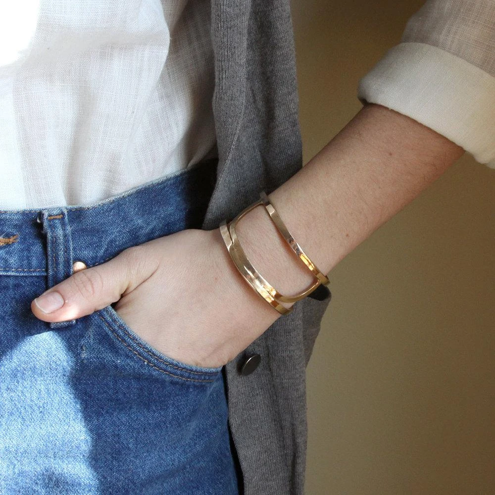 Part of the Bentwood Collection, the 209 Cuff is inspired by the shapes used in Michael Thonet’s iconic bentwood chairs. Like Thonet’s designs, these pieces have a timeless quality with organic, rounded curves and a sense of movement. The 209 Cuff is available in polished bronze or sterling silver. This substantial cuff was sculpted in wax before being cast in metal.