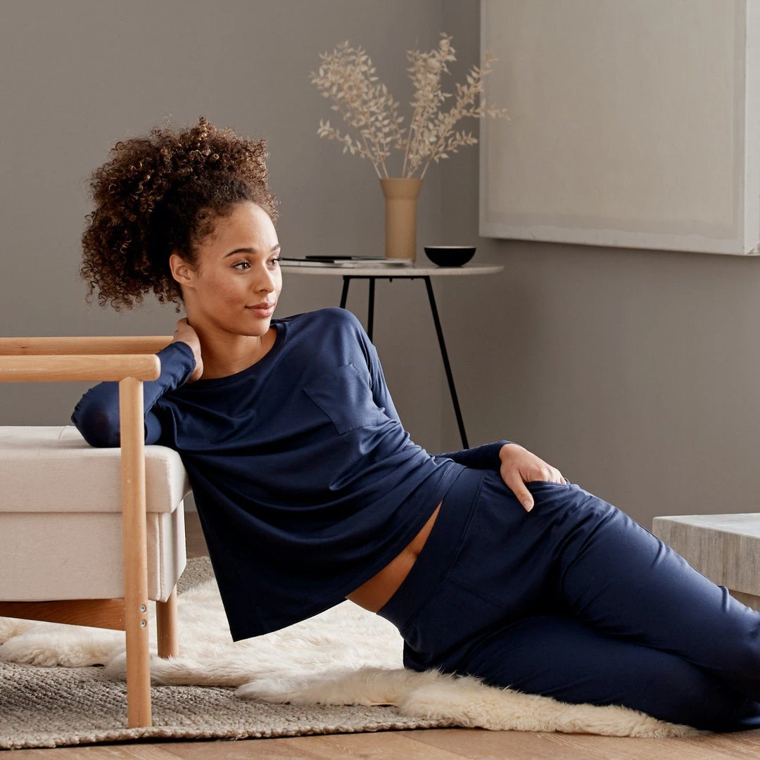 This Eucalyptus Long Sleeve Top is a chic, mix-and-match piece that will add a perfect blend of comfort and luxury to your wardrobe. Eucalyptus material is extremely soft, breathable, and lightweight, making this piece versatile for layering or wearing alone. Worn here with the Eucalyptus Lounge Pants and Eucalyptus Joggers.