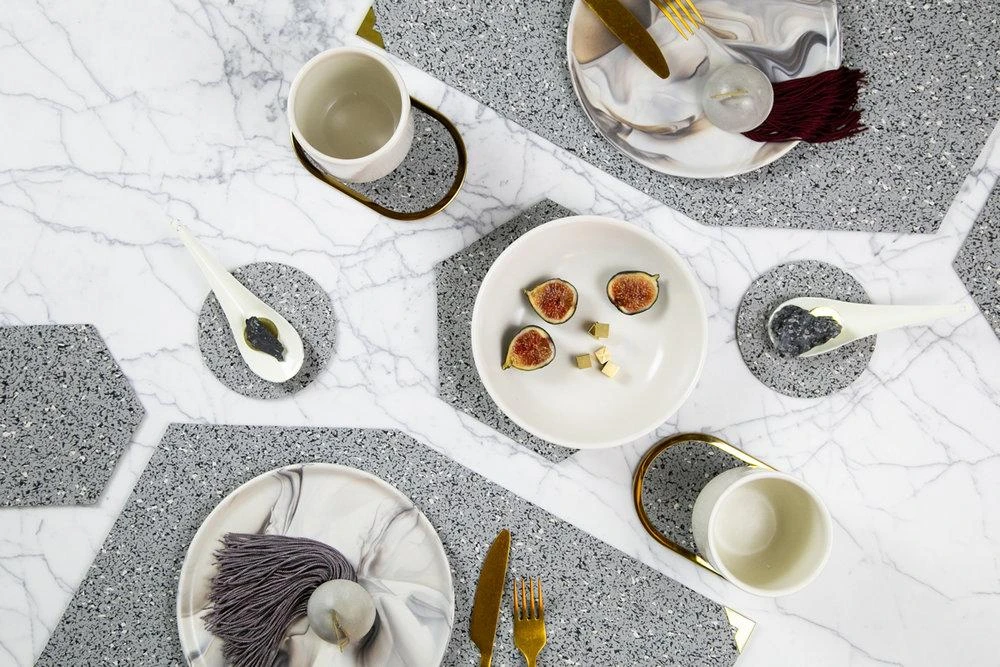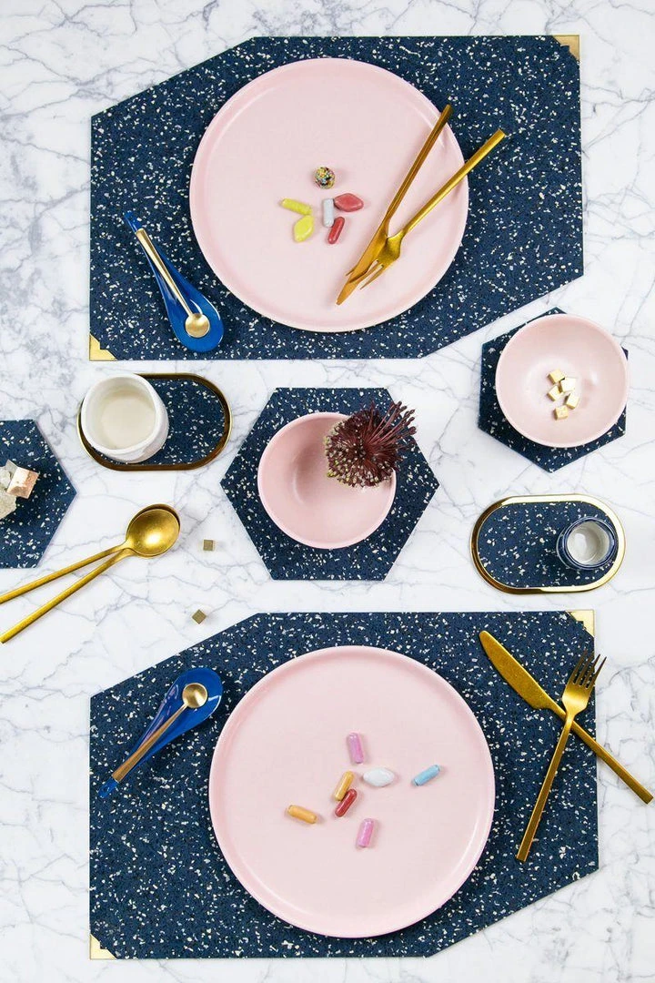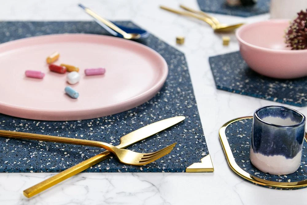 These rubber placemats with brass corner guards make for a unique, durable and beautiful table protector. Mix and match colors or go monochrome for your dinner table setting.