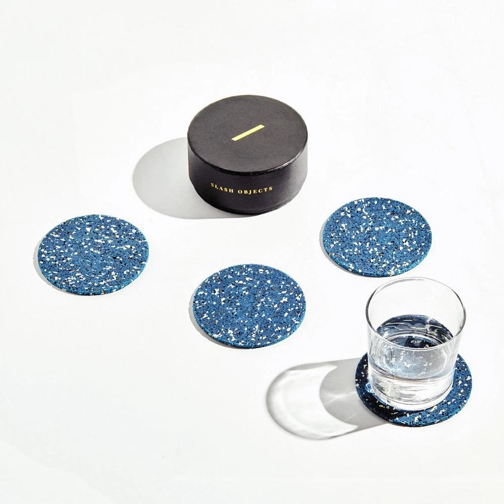 Set of four round coasters made of recycled rubber to protect your surfaces in style.