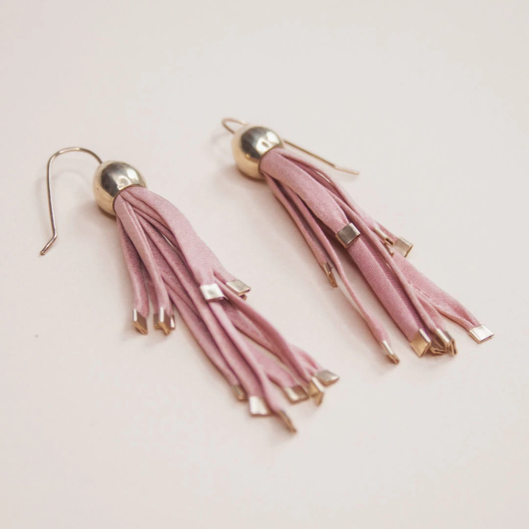 The Pod and Strand Earrings feature two tiers of silk strands falling from a pod of bronze or silver. The design creates a swaying, swinging, movement inspired by a siren’s seaside adornment. Each pair is expertly handcrafted in the California Bay Area. Due to the hand dyed nature of the jewelry slight variations in color are to be expected.