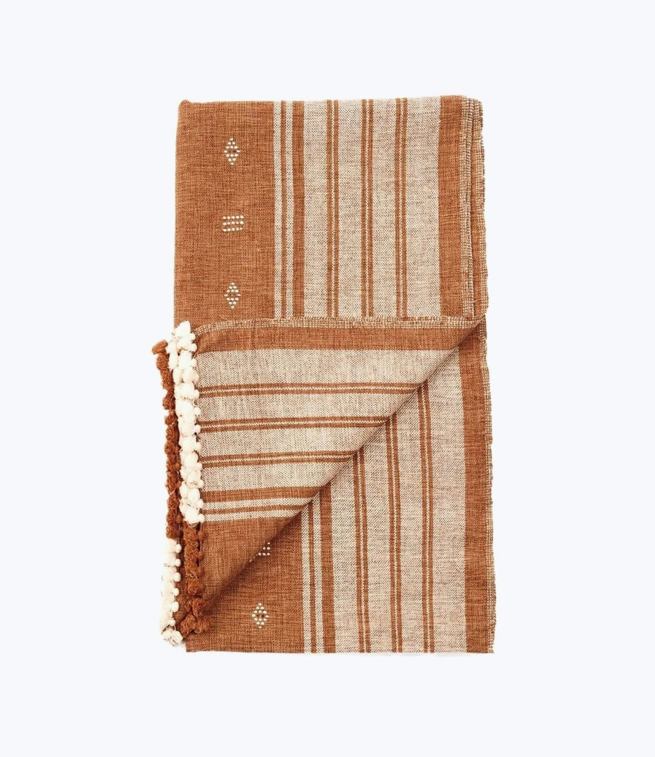 The Reyti is an organic cotton blanket, woven using an ancient hand-looming technique that originated in the western part of India. Reyti means mud or sand in Hindi. The edges are hand-rolled and the design is hand-embroidered. It takes an incredibly skillful master artisan to make this special piece.