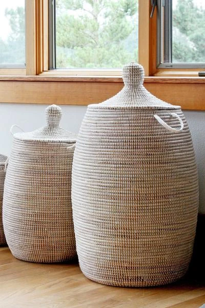 Wolof weavers in remote Senegal design hampers and baskets woven from the salvaged plastic strips and cattail stalks. First introduced by the Peace Corps, Swahili and more than 120 Wolof women prove that cooperative, home-based craft export is an excellent way for rural women to earn fair trade incomes that build healthy communities.