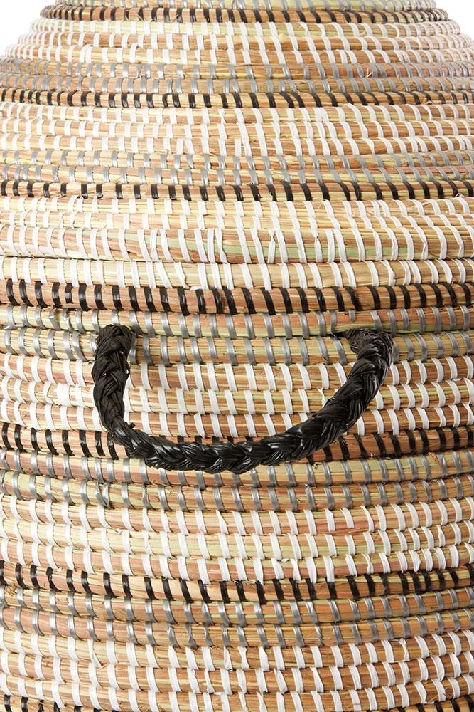 These laundry hampers are handwoven by more than 100 rural Wolof women. Crafting baskets allows women to earn income from the comfort of their community. Using abundant and renewable cattail stalks bound with salvaged plastic strips procured from a local mat factory, the women hand-weave each of these hampers. These handcrafted baskets may vary slightly as compared to the the photos, as each set is unique.