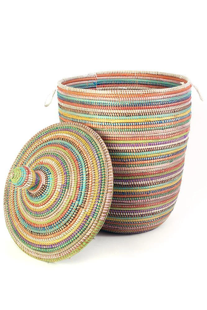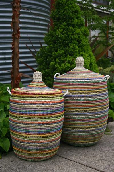 These durable, beautifully crafted baskets brighten any room of your home while providing an impressive amount of storage. This laundry hamper is handwoven by an association of more than 100 rural Wolof women in the West African nation of Senegal. The artisans hand-weave each of these hampers using abundant and renewable cattail stalks bound with salvaged plastic strips procured from a local mat factory. These handcrafted baskets may vary slightly as compared to the the photos, as each set is unique.